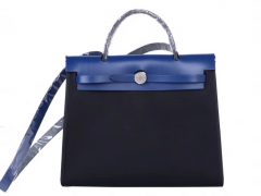 Hermès(爱马仕)Herbag 手提单肩包 电光蓝马鞍皮拼 黑色帆布 银扣 31cm