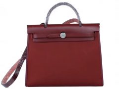 Hermès(爱马仕)Herbag 手提单肩包 酒红马鞍皮拼 原色帆布 银扣 31cm