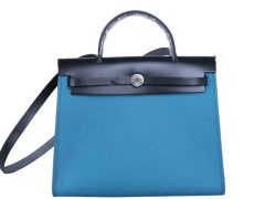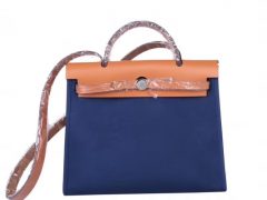 Hermès(爱马仕)Herbag 手提单肩包 驼色拼午夜蓝 帆布 银扣 31cm