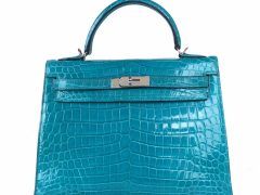 Hermès(爱马仕)Kelly 凯莉包 湖水蓝 亮面鳄鱼 银扣 28cm