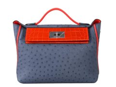 Hermès(爱马仕)Kelly 2424 玛瑙蓝鸵鸟拼法拉利红鳄鱼 银扣 29cm