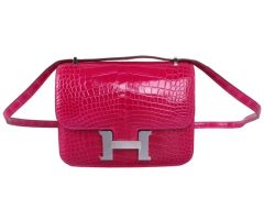 Hermès(爱马仕)Constace 空姐包 桃红色 亮面鳄鱼 银扣 19cm