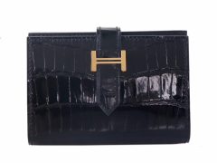 Hermès(爱马仕)Bearn 小H扣 短款钱夹 黑色 亮面 鳄鱼 金扣