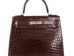 Hermès(爱马仕)Kelly 凯莉包 咖啡色 亮面鳄鱼 银扣 28cm