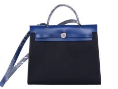 Hermès(爱马仕)Herbag 电光蓝拼马鞍皮 原色帆布 31cm 现货