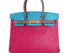 Hermès(爱马仕)Birkin 铂金包 斑鸠灰拼桃红拼马卡龙蓝 鸵鸟皮 金扣 30cm
