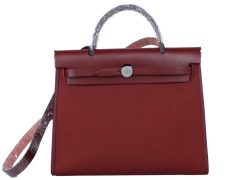 Hermès(爱马仕)herbag马鞍包 酒红马鞍皮拼原色帆布 31cm