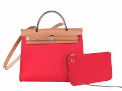 Hermès(爱马仕)herbag马鞍包 驼色马鞍皮拼爱马仕红 帆布 31cm