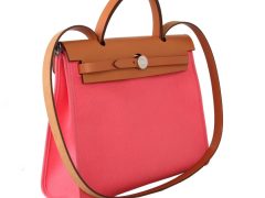 Hermès(爱马仕)herbag马鞍包 唇膏粉 马鞍皮拼原色帆布 31cm